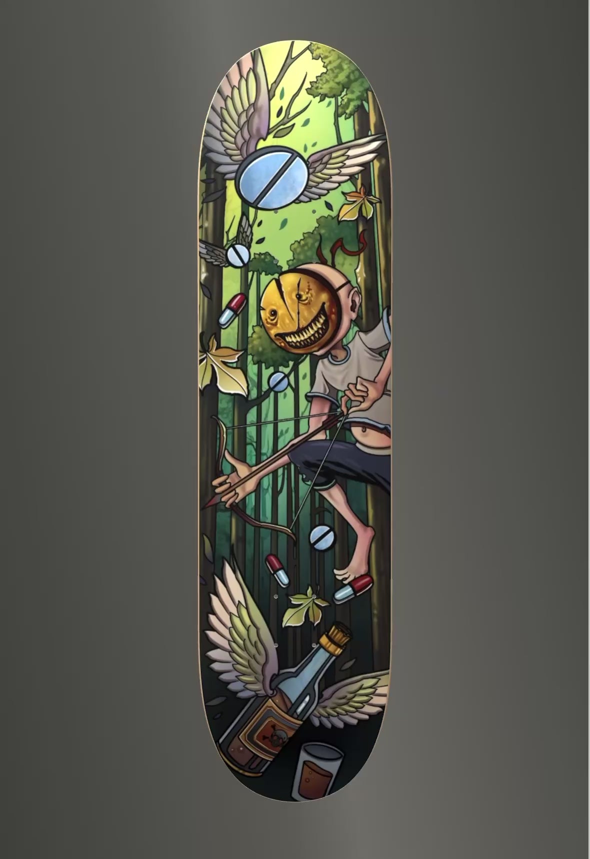 Never Better boards first deck “Hunting for a buzz” the design was inspired by my recovery from opiate addiction depicting an addict hunting for his preferred substance to feed the mask of false and fake happiness he wears. The mask hides the truth of the pain he seeks to comfort. It was the realization for me that the happiness and comfort felt was a facade and the hunt for the poison that was supplying me this was futile. I spent years of my life stealing my dopamine from substances when dopamine should be in fact earned. I earn my dopamine through my hobbies and healthy addictions now. Skateboarding has been such a huge help to me and many others for their mental health and sobriety 🤘help make our community stronger!